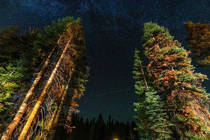 Looking down the mountain, I could see the faint glimmer of the lights from Frontier Ranch. Trees mostly covered them on the path down, and above those trees, the dark silhouettes of mountains in the distance supported a sky full of stars glowing brightly and unaffected by light pollution. Collectively, they spoke to the grandeur of the universe. I sat in silence, only broken by the occasional movement of my own body in the leaves and pine needles. To better take in the view, I lay on my back, looking at all the dots of light from the billions of stars in my field.